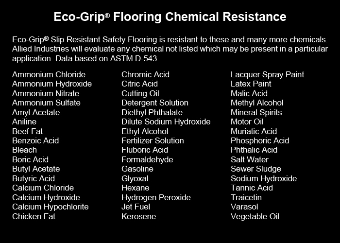 Eco-Grip Slip Resistant Safety Flooring is resistant to many chemicals.